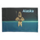 Ein braunes Fraktal-Bild, das auf einen hochstilisierten Inuit-Jäger hinweist, der traditionelle Pelzkleidung trägt und einen Harpunen mit Elfenbeinkopf trägt. Das Bild ist auf einem Hintergrund überlagert, der den dunklen polaren Winter darstellt. "Alaska" erscheint in blau-weiß.
