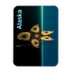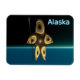 Ein braunes Fraktal-Bild, das auf einen hochstilisierten Inuit-Jäger hinweist, der traditionelle Pelzkleidung trägt und einen Harpunen mit Elfenbeinkopf trägt. Das Bild ist auf einem Hintergrund überlagert, der den dunklen polaren Winter darstellt. Text liest, "Alaska" erscheint in leuchtendem Blau und Weiß.