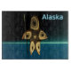 Ein braunes Fraktal-Bild, das auf einen hochstilisierten Inuit-Jäger hinweist, der traditionelle Pelzkleidung trägt und einen Harpunen mit Elfenbeinkopf trägt. Das Bild ist auf einem Hintergrund überlagert, der den dunklen polaren Winter darstellt. Der Text "Alaska" erscheint in leuchtendem Blau und Weiß.