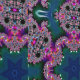 Dieses Fraktal ist ein lebendiges, kaleidoskopisches Kunstwerk, das mit komplizierten Mustern und wirbelnden Designs aufwartet. In der Mitte strahlt eine dunkelblaue Sternenform nach außen, umgeben von lebendigen, rosafarbenen, lila und orangefarbenen Trismen. Die komplizierten Schleifen und Kurven schaffen eine faszinierende Symmetrie, während grüne und aquamarine Zeichen Tiefe und Kontrast hinzufügen. Das Kunstwerk ruft ein Gefühl unendlicher Komplexität und kosmischer Wunder hervor, indem Geometrieelemente und Bio Elemente in ein hypnotisches, fremdartiges Design fließen. Perfekt für diejenigen, die zur Schönheit der mathematischen Kunst und abstrakten Ausdruck gezeichnet.