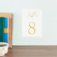 Einfache und schicke Tischnummer-Karten in Weiß mit Goldfolie-Schrift machen bei Ihrer Hochzeit oder Veranstaltung ein elegantes Statement. Das Design enthält handgeschriebene Kalligrafieschrift mit Ihrer Tischnummer in klassischen Zahlen. Der Druck auf der Single soll wie gezeigt in einen Tischrahmen gesetzt werden.
