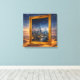 A floating frame encloses a glowing futuristic city, as if it were a living painting.