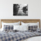 This contemplative black-and-white photograph captures a tranquil river framed naturally by overhanging trees and leaves. The stillness of the water mirrors the soft sky, while the gentle ripples and subtle reflections draw the eye toward the distant horizon. A quiet moment of connection between land, water, and sky—this image evokes peace, presence, and a return to nature. Ideal for mindfulness spaces, lake house decor, or anyone who finds calm near water.