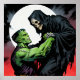Two iconic figures stand against a vibrant full moon. The contrast between Frankenstein's green skin and the Grim Reaper's dark cloak creates a dramatic tension.