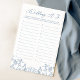 Fügen Sie Ihrem Brautparty mit der blauen Chinoiserie Floral Shower A-Z Game eine Vintage Eleganz hinzu! Dieses atemberaubende Spiel bietet prächtige französisch-blaue und weiße barocke Blumendesigns für eine Touch von Chinoiserie Stil. Dieses köstliche Brautparty-Spiel ermuntert Ihre Gäste dazu, für jeden Buchstaben des Alphabets ein Wort zu finden, das sich auf Liebe, Ehe und die Beziehung von Braut und Bräutigam bezieht. Es wird sicher alle zum Lachen bringen und süße Erinnerungen teilen. Die französischen Motive in Blau und Blumen verleihen dem Ganzen eine raffinierte Touch. Die blaue Chinoiserie Blumendusche A-Z Game ist die perfekte Unterhaltung für ein stilvolles, Vintages oder chinoiserie thematisches Brautparty. Sowohl die Braut als auch die Gäste werden dieses herrliche Spiel bewundern!