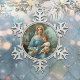 Das französische Dekor der Blauen Madonna zeigt ein Bild einer schönen antiken französischen heiligen Karte, die Ende des 19. Jahrhunderts gedruckt wurde. Jesus und die gesegnete Mutter sind umgeben von flatternden weißen Tauben und einer rauen Waldlandschaft.