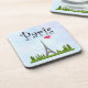 Untersetzer mit einem skurrilen zeichn des Eiffelturms, umgeben von grünen Bäumen und einem rosa, in der Luft schwebenden Wasserfarbenherz. Hellblauer Hintergrund.