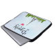 Laptop-Ärmel mit einem skurrilen zeichn des Eiffelturms, umgeben von grünen Bäumen und rosa Wasserfarbenkern, die in der Luft schweben.