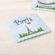 Untersetzer aus Papier mit einem skurrilen zeichn des Eiffelturms, umgeben von grünen Bäumen und einem rosa Wasserfarbenherz, das in der Luft schwebt. Hellblauer Hintergrund.