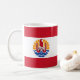 Entwurf mit der Flagge Französisch-Polynesiens (Überseeland der Französischen Republik); rote und weiße Flagge mit Wappen in der Mitte
