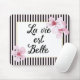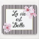 Dieses feminine, schicke Mousepad enthält die französische Phrase "La vie est Belle", oder "Life is Beautiful" in schwarz elegantem Drehbuch mit einem Imitat Goldfolie dünnen Rahmen. Der Rand des Mousepads besteht aus schwarzen und rosa Streifen aus Paris, und die Ecken sind mit schönen illustrierten Kirschblüten geschmückt.