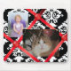 Reizende kundenspezifische Mausunterlage getan in einem französischen Anschlagbrettblick, mit einem Hintergrund des Schwarzweiss-Damastes und rote Bänder und Knöpfe. Personifizieren Sie dieses große mousepad mit Ihren Lieblingsphotographien, oder machen Sie ein als Geschenk. Groß für Zuhause oder Ihr Büro wird jeder Liebe es.