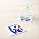 Personalisierte Untersetzer mit quadratischem Party zeigen das Wort LIEBE in blauen Buchstaben an. Eine herzförmige Flagge Frankreichs dient dem O in der LIEBE. Ideal für Vatertag oder Muttertag, um sich zu treffen. Spaß für die Feiern zum Bastille-Tag. Immer cool für Wiedersehen mit Familie oder Freunden.