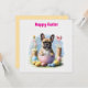 französische Bulldogge wünscht Happy Easter mit vielen pastellfarben angemalten Eiern und einer rosa Schleife. Der niedliche Hund sitzt in einem Osterei und hat tolle Geschenke mitgebracht. Bunte Frühlingsblumen und ein blauer Himmel runden das schöne Tiermotiv ab. Für jeden Hundeliebhaber ein schönes Geschenk.