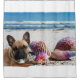 Hübsche französische Bulldoggen am Strand mit Muscheln.
