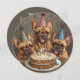 Niedliche Darstellung der französischen Bullhunde, die einen Geburtstag feiern und Party-Hüte tragen und Kuchen essen. Ideal für Liebhaber von Haustieren oder Hundeeltern.
