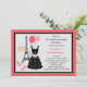 Schicke und moderne Geburtstagseinladung mit einem französischen Thema. Kennzeichnet schwarze Tupfen ankleiden, ein Paar Absatzschuhe, ein Geldbeutel und zwei Ballone mit dem Eiffelturm im Hintergrund. Ein Kamm-Muschelrand beendet diese ins Auge fallende Karte. Groß für eine Frau oder einen jungen Erwachsenen, der freundliche, Energie- und Liebemode ist. Pariser Blick mit einer hellen Farbpalette. Kann für jeden möglichen Geburtstag verwendet werden. Addieren Sie Ihre eigene Benennung.