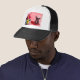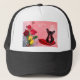 Französischer Bulldog sitzend auf Herzklopfen und Truckerkappe