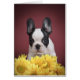 Französisch - Französischer Bulldog Welpe mit gelben Blumen auf rotem Hintergrund