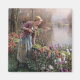 Dieses Design zeigt ein Gemälde des amerikanischen Künstlers Daniel Ridgway Knight (1839-1924). Es zeigt eine schöne junge Frau, die eine Holzstange in der Hand hält. Sie guckt in den Fluss, um zu sehen, ob sie einen Fisch gefangen hat. Es gibt blühende Blume in leuchtenden Farben um sie herum. Es gibt auch ein paar Fische an ihren Füßen, die sie schon gefangen hat. Es ist eine attraktive Szene des traditionellen Lebens und des Vintagen Fischens.