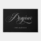 Diese französische moderne und elegante Fußmatte sagt "bonjour" in der Wirblen, weißen Skriptkalligraphie auf einem schwarzen Hintergrund und hat eine Stelle für Ihren Familiennamen.