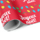 Ein festliches Weihnachtswarppapier mit Weihnachtsbeleuchtung und einem fröhlichen Weihnachtswunsch in französischer Sprache. Es sagt "Joyeux noël!" in einem schönen kursiven Schreiben.