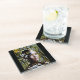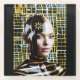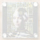 Eine Frau mit Glatzenkopf und futuristischen, schwarz-goldgestreiften Posen vor einem geometrischen Hintergrund. Sie hat eine dekorative gelbe Blume auf ihrer Stirn.