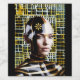 Eine Frau mit Glatzenkopf und futuristischen, schwarz-goldgestreiften Posen vor einem geometrischen Hintergrund. Sie hat eine dekorative gelbe Blume auf ihrer Stirn.