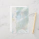 Eine Frau, die am Seeufer stehend ist und ein blaues Kleid mit blauem See neben ihr trägt und hinter ihr im Hintergrund landet. Auf der links Seite stehen Imitate, weißes Papier, die mit goldfarbenem Zierrahmen und türkisfarbenem aquamarinem Hintergrund umgeben sind.