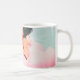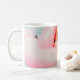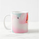 Frau auf rosa aufblasbarem Flamingo im Außenpool Kaffeetasse