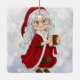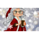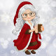 Ein fröhlicher Charakter, gekleidet in einem festlichen roten Mantel und Hut, mit flauschigem weißen Trimm. Sie hat langes graues Haar und große Gläser, die ein Getränk in beiden Händen halten. Im Hintergrund fallen sanft abfallende Schneeflocken, die einen skurrilen Winter schaffen.