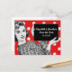 Erstellt aus einer Vintagen Illustration aus den 50er Jahren einer Frau, die ein Schild hält. Hintergrund ist ein niedliches rot-weißes Polka-Punktmuster, das man ändern kann. Passen Sie es mit Ihrem eigenen Text an. Ideal für Ihre Retro-thematische Hochzeit!