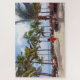 Eine Frau in rotem Kleid an einem schönen Sandstrand mit Kokospalmen.