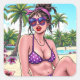 Frau in Bikini und Bandanna am Strand Quadratischer Aufkleber