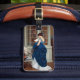 Eine Frau in blauem Gewand hat das Party für die Bibliothek verlassen.