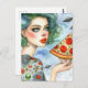 Frau mit einem großen Stück Pizza und UFOs Postkarte