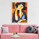Dies ist ein Bild einer Frau mit einem Hut im modernen Stil. Die Frau trägt einen schwarzen Hut und eine blaue Bluse mit einem roten Schal. Der Hintergrund besteht aus warmen Farbtönen in geometrischen Mustern. Das Gemälde verwendet fette Farben und Linien, um Kontrast und Interesse zu schaffen. Dieses Gemälde würde eine großartige Ergänzung zu jeder Kunstsammlung oder als Statement-Stück in einem Raum darstellen. Es kann auch auf verschiedenen Produkten wie T - Shirt, Telefonzellen usw. gedruckt werden