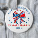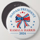 Frau Präsidentin Kamala Harris 2024-Wahlknopf für Demokraten und Kamala-Anhänger - mit patriotischen roten, weißen und blauen Koketten-Bugband und Sternen.