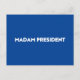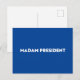 Frau Präsidentin! Moderne Typografie blau-weiße Postkarte. Weißer fett formatierter Text auf blauem editierbarem Farbhintergrund. Man kann es personalisieren und einzigartig machen. Feiern Sie den Präsidenten der Nation am Tag der Amtseinführung des Präsidenten. Auch kann dies ein großartiges Geschenk zum Feiern einer weiblichen Chefin, die Präsident geworden ist. Präsident eines internationalen Unternehmens, eines Konzerns, eines kleinen Unternehmens, Chef, Präsident Ihrer Klasse, Studentenpräsident, etc.