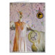Ein digitales Bild eines Smew in einem rosa Flatterkleid mit Spitzen-Halsketten. Es gibt einen Stuhl mit einem weißen Kleid und einem Hut, der darauf ruht. An der Wand hängt ein antikes Porträt einer Ente in einem dunkelbraunen, runden Holzbild. Die Wand ist mit rosa Tapeten mit tropischen Vögeln geschmückt. Copyright ©2017 Kimberly J Tilley.