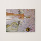 Ein digitales Bild eines Smew in einem rosa Flatterkleid mit Spitzen-Halsketten. Es gibt einen Stuhl mit einem weißen Kleid und einem Hut, der darauf ruht. An der Wand hängt ein antikes Porträt einer Ente in einem dunkelbraunen, runden Holzbild. Die Wand ist mit rosa Tapeten mit tropischen Vögeln geschmückt. Copyright ©2017 Kimberly J Tilley.