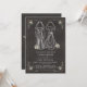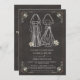 Elegante Frau & Frau Lesbian Hochzeit Einladung mit zwei handgezeichneten Hochzeitskleider auf einem Chalkboard Hintergrund, Blumenrahmen und Details in trendiger Schrift.
