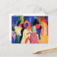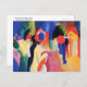 Eine Postkarte mit Aquarellmalerei, mit Gelbweste oder Mit Gelber Jacke (1913), von August Macke (1887-1914), einem deutschen expressionistischen Maler. Eine abstrakte Darstellung einer Gruppe von Menschen mit einer Frau in einer gelben Jacke im Vordergrund.