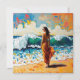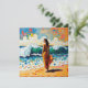 Leere Karte, um Notizen für sich selbst zu schreiben oder an einen Freund zu sagen, hi und behalt in der Touch. Eine schöne Illustration in einem Ölgemälde im Stile von impasto. Eine Frau, die am Strand mit einem abstrakten Mosaik geht und einen lebhaften, bunten Stil hat.