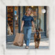 Frauen mit dunkelblauem runden Nacken-T - Shirt, die mit belgischem Malinois-Hund spazieren gehen, im Heimtierladen einkaufen