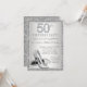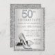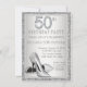 Die 50. Geburtstagsfeier der Frau mit eleganten silbernen Diamantenzahlen und Glitzer-High-Heel-Schuhen auf einem wunderschönen silbernen Glitzer-Hintergrund. Passen Sie diese herrliche Silber Geburtstagsfeier-Einladung an, indem Sie einfach Ihre Details in den Schriftart-Stil und die Farbe Ihrer Wahl. Dies ist ein gedrucktes Design ohne echte Diamanten, Juwelen, Glitzer, etc.