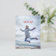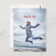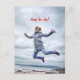 Eine großartige Postkarte mit einem Foto einer Frau, die aus Steinen am Strand springt. Ihre Arme und Beine sind teilweise ausgestreckt und verwandeln sie in einen Krabbensprung. Sie trägt eine gepolsterte Jacke gegen die Kälte, und ihr Haar zieht im Wind an. Mit einem fröhlichen Ausdruck und weiten Augen wirkt der Eindruck von wildem Überschwang. Bildcode: hrcol149