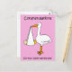 Ein Cartoon, der ein Baby in einer Tabelle hält, die von seinem Schnabel hängt. Das Bild hat einen hellrosa Hintergrund und wird von den Worten "Gratulation zu Ihrem Baby naming Day" begleitet.