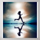 Die weibliche Runner Silhouette spiegelt sich unten mit einem weichen pastellfarbenen Sonnenuntergang als Hintergrund wider