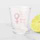 Schießglas mit feministischer Botschaft, mit rosa Frauensymbol und "Frauenrechte sind Menschenrechte" im Schriftart mit Pinselstrich
